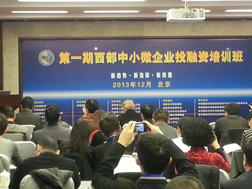 2013年12月12日-13日,中国西部开发促进会在北京举办了“第一期西部中小微企业投融资培训班”。 培训班会场 此次培训班以工信部、中国社科院、中国浦东干部学院、中国银监会及云南、甘肃、贵州金融办为指导单位,云南泛亚小微金融研究院、日信证券有限