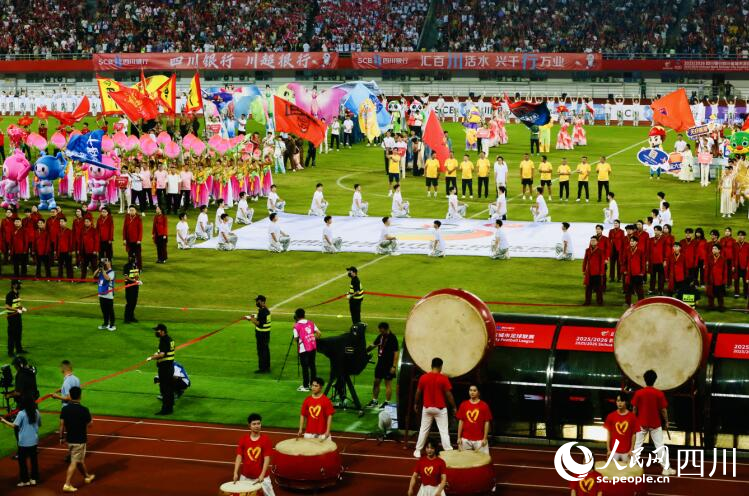 开幕式现场。人民网记者 朱虹摄 人民网成都9月20日电 (朱虹、罗昱、张玉琳)9月20日晚,2025/2026四川银行四川省城市足球联赛(以下简称“川超”)在成都双流体育中心启幕,揭幕战由成都队坐镇主场迎战遂宁队。揭幕战开始前举行“川超”开幕式,通过一场