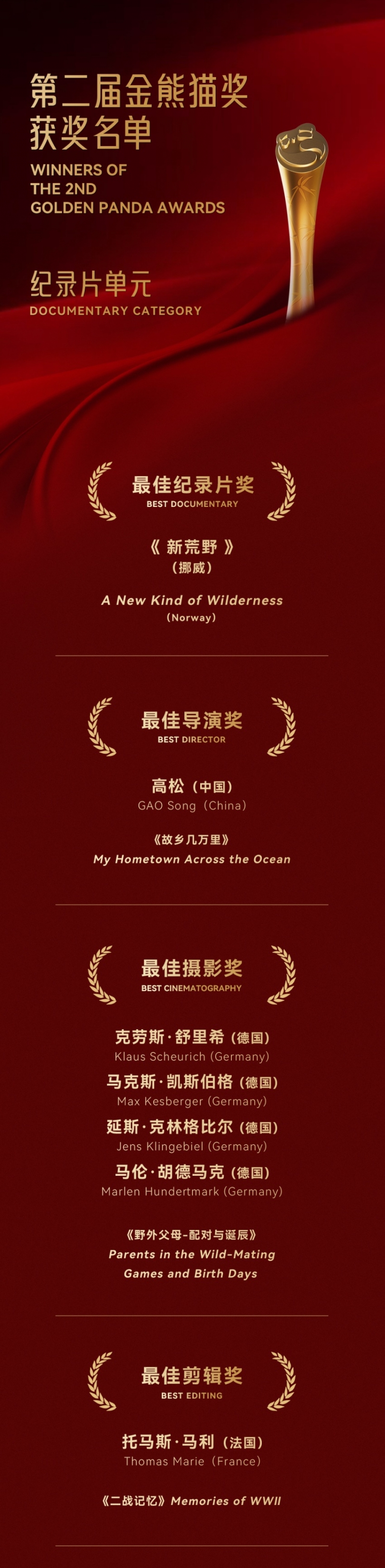 人民网成都9月14日电 (赵祖乐、刘海天)9月13日晚,第二届金熊猫奖在成都揭晓。四大单元中,首先揭晓的是纪录片单元的奖项。其中,来自挪威的《新荒野》拿下最佳纪录片奖;来自中国的导演高松凭借作品《故乡几万里》拿下了最佳导演奖。纪录片单元获奖名单如下:第二届金熊猫奖