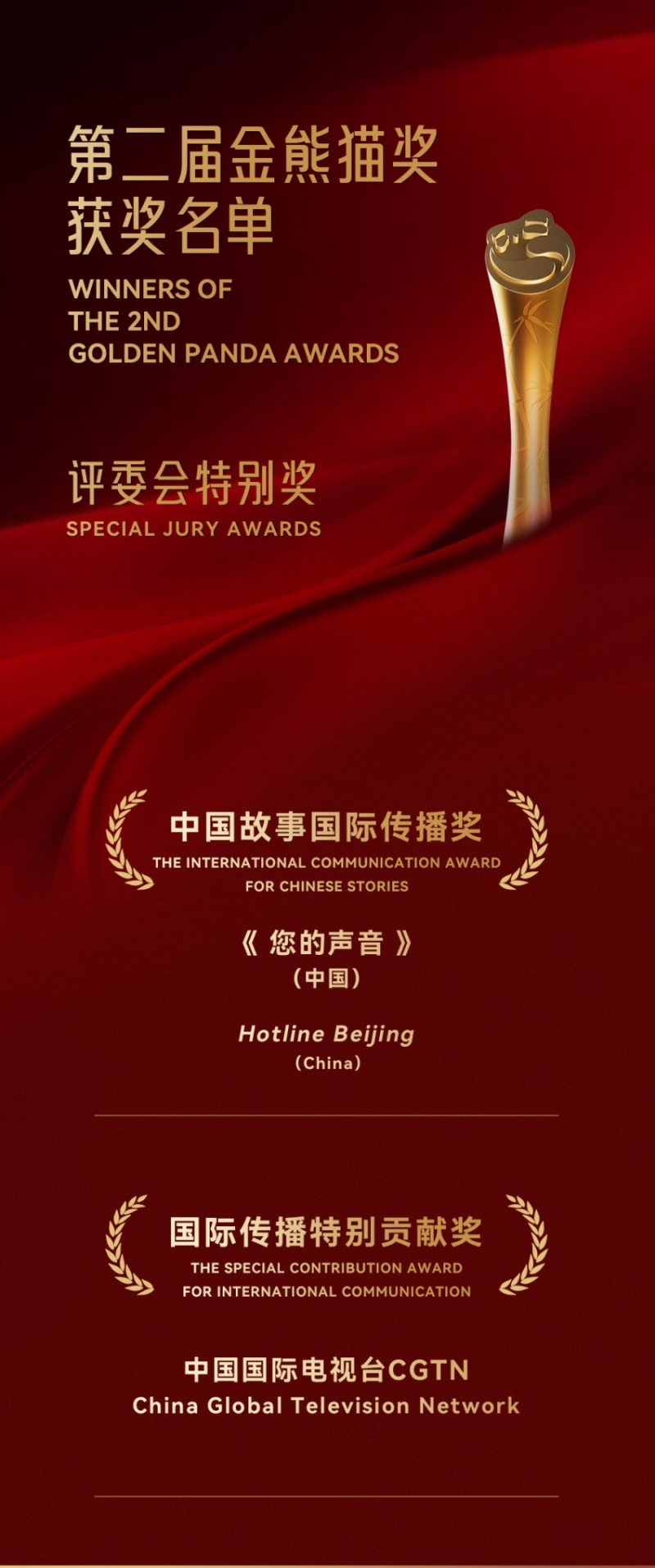 人民网成都9月14日电 (赵祖乐、刘海天)9月13日晚,第二届金熊猫奖颁发评委会特别奖,纪录电影《您的声音》获得中国故事国际传播奖,中国国际电视台CGTN获得国际传播特别贡献奖。第二届金熊猫奖评委会特别奖获奖名单。主办方供图 (责编:李强强、薛育建)