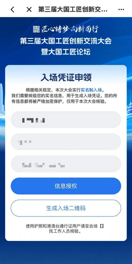 信息授权后,系统将生成个人专属入场二维码,该二维码作为大会入场凭证(具有时效性)。入场时请出示二维码,经现场扫描核验无误后即可进入会场。