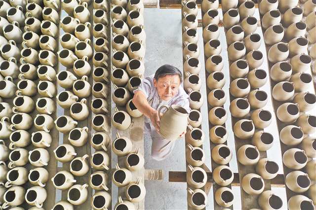 9月14日,黔江区濯水镇石鸡砣土陶非遗工坊,传承人刘沛良在检查茶罐陶坯质量。 黔江区濯水镇石鸡砣土陶制作技艺有1000多年的历史,是重庆市非物质文化遗产代表性项目。该区把石鸡砣土陶制作技艺与文旅结合,先后建立石鸡砣土陶非遗传承基地、石鸡砣土陶非遗工坊,并对脱贫