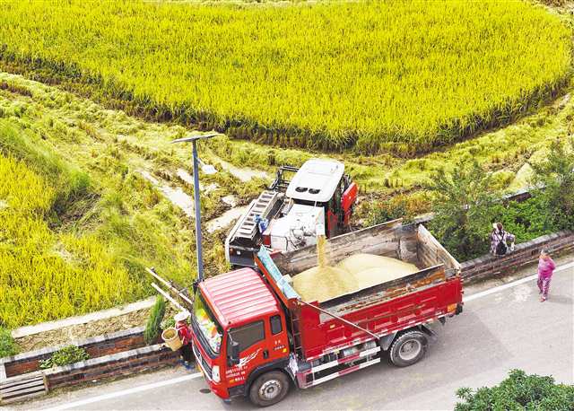 9月11日,梁平区蟠龙镇扈槽村,收割机在金黄色的稻田里收割水稻(无人机照片)。 初秋时节,梁平区蟠龙镇扈槽村的高山优质水稻喜获丰收,当地农民趁着晴好天气加紧抢收,力争颗粒归仓。 据了解,梁平区蟠龙镇扈槽村地处高海拔地区,当地农民用冷沙田种植的大米获评“重庆