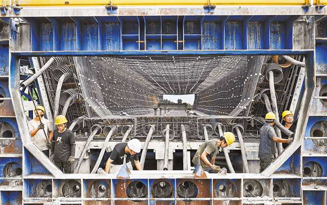 9月10日,位于铜梁区庆隆镇的中铁四局成渝中线重庆段站前2标铜梁制梁场,工人正在安装箱梁的端模。 中铁四局成渝中线重庆段站前2标铜梁制梁场,承担了成渝中线高铁重庆段共690孔箱梁的预制架设施工任务,截至目前完成制梁435榀、架梁364榀。(记者 谢智强 摄/视觉重庆)