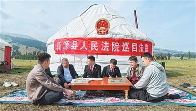 日前,新源县人民法院那拉提人民法庭法官深入牧区,在牧民的毡房前开起巡回法庭,现场调解一起草场纠纷(见图)。
