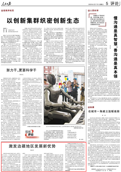 边疆地区连接内外、通达四方,在交通发达、物流完善的今天,拥有巨大优势。在位于新疆的中哈霍尔果斯国际边境合作中心,中国消费者可以买到哈萨克斯坦的蜂蜜、吉尔吉斯斯坦的毛毯、乌兹别克斯坦的干果,而中国产的家电、家具、服装等,也从这里销往中亚、西亚、欧洲等地。广西发挥背靠祖国、面向东盟的区位优势,正积极构建“北上广研发+广西集成+东盟应用”的人工智能产业生态圈。既积极融入新发展格局、融入国内统一大市场,又坚持扩大高水平对外开放,边疆地区大有可为、大有作为。