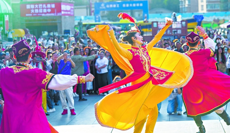 近日,游客在新疆国际大巴扎景区欣赏舞蹈。随着秋季旅游旺季到来,各地游客纷纷来到该景区拍照打卡,享受美好生活。 孙振嵩摄 9月23日,为庆祝自治区成立70周年、欢庆“中国农民丰收节”,和布克赛尔蒙古自治县查和特乡举行了一系列活动。图为群众进行舞狮表演。